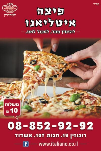 ואם בפיצות עסקינן, תרשו לנו לפרגן לאיטליאנו – שהיא ממש כאן, מתחת לאף של כולנו, פינת רוגוזין, בבעלות אושרי ניזרי. אין ספק שמדובר באחת הפיצריות המובילות בישראל וכנראה המובילה באשדוד, שמצליחה לעמוד בעומסים ובלחצים לאורך כל היום ומתקתקת מגשים, מאפים ומוקרמים לכל רחבי העיר, בזריזות, מקצועיות והטעם.. אלוהי!!